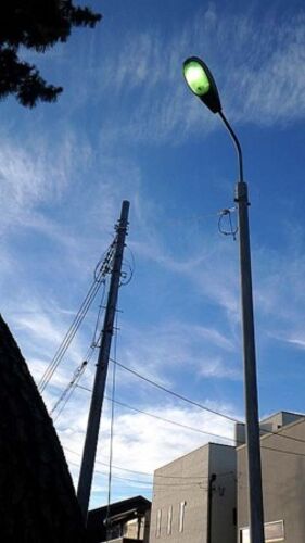 夏至を過ぎ、雑節の1つ半夏生の候だが、明るい青空のもと水銀灯が元気に煌々と光っている。 冬季でも少しでも暗くなると点灯していたようで、要するにエコではない。 市役所に電話して、光度センサ設定がずれている気がすると連絡した。