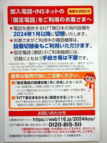 2024年1月に加入電話回線設備切替を行う旨葉書が来た。“騙り”を謳う輩が出てくるのを防ぐためと考えられる。