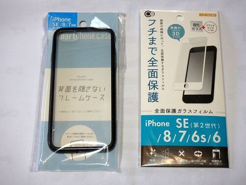 セリアにて。・背面を隠さないフレームケース・・・押しボタンも保護される・フチまで全面保護ガラスフィルム・・・Rが付いている画面フチに対応両方で、本体がぴったり保護された。
