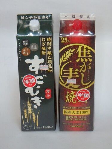 ウエルシア薬局越谷東大沢店。 現品処分品。オエノン混和麦焼酎・すごむぎ1800/25:494円(11.0円/アルコール)いそのさわ焦がし麦100% 1800/25:704円(15.6円/アルコール)