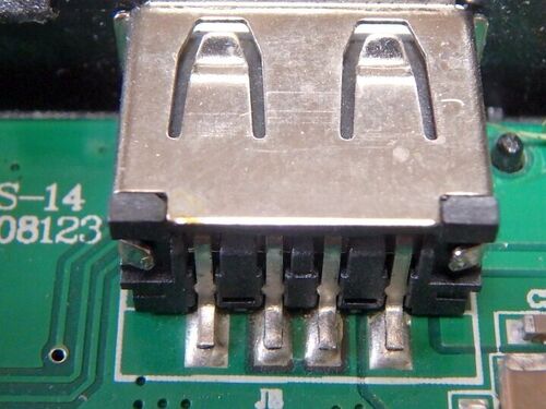 出力不安定:USBプラグ位置で電圧変動する事象が発生中のもの。中を見ると、AタイプUSBコネクタ(メス)の基板との半田がグラグラ。もともとのハンダ量が少ない上に、(挿入する)オスコネクタ側でも結構乱暴に扱ったのだろう。当該基板は他にも水没痕跡が認めら…
