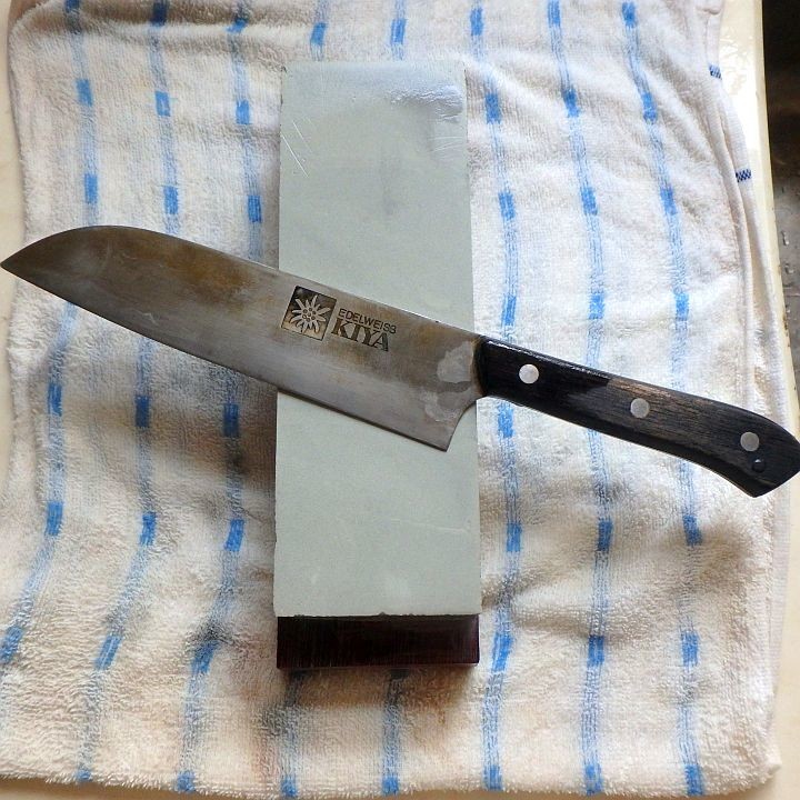 2021-08-26 包丁砥ぎ DIY ふと思いついて、包丁砥ぎ。日本橋「木屋」のエーデルワイスの洋包丁とペティナイフ(写真には無い)。特に小型包丁にサビのようなものが付いていた。砥石に当てたら簡単に除去できた。