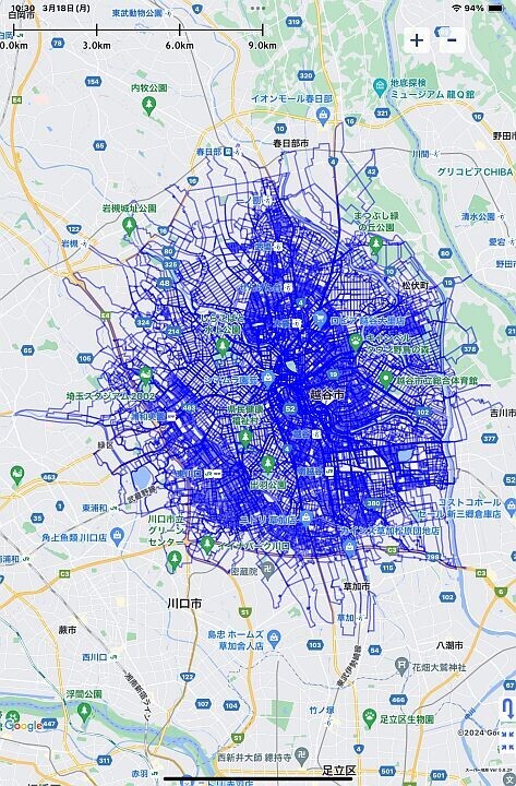 2024-03-18 「徒歩」が一万キロメートルを越えた 旅行 689日経過。徒歩距離:10,016.0㎞。 平均距離:14.5km、最長距離:26.7km/4時間34分(35,067歩:変更有)合計歩数:13,562,375歩、平均歩数:19,886歩最北端:春日部市下柳 柳橋(下)交差点西詰(変更有)最南端:草加市氷川町120付近(変更有)最西端:さいたま市緑区 大道橋(変更有)最東端:吉川市川藤 県道378号川藤交差点(変更無)